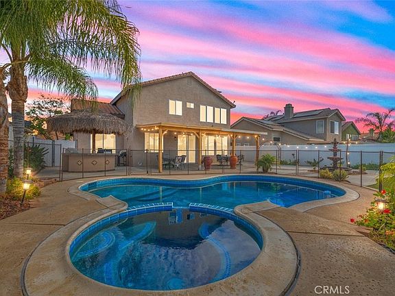 Beautiful Orangecrest pool home recently renovated from top to bottom! This 4 bed, 3 bath home is centrally located near schools, shopping, and freeways. The main floor boasts vaulted ceilings, oversized ceramic tile, remodeled kitchen with white cabinets, quartz counters, built-in oven, hood and pantry. In addition, you'll find the main floor laundry room and guest bath. Upstairs, the primary bedroom and bathroom includes a double door entry and view of the beautiful backyard. As you enter the backyard, you will find a fully fenced pool and spa, built-in BBQ, and water fountain. The covered patio and BBQ palapa make this home an entertainers dream!
