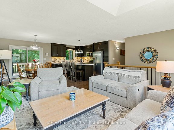Tucked away on a quiet cul-de-sac and backing onto a stunning ravine, this raised Bungalow offers the perfect blend of peace, privacy and convenience in one of the West side's most sought-after neighbourhoods. Just 12 years old and built to impress, this 3-bedroom, 2-bath gem is wrapped in premium Shouldice stone for timeless curb appeal and durability. Step inside and be wowed by the open concept main floor; bright, spacious and perfect for both everyday living and entertaining! Hardwood floors flow throughout the main floor into the open concept living and dining areas and the kitchen that shines with stainless steel appliances, a centre island and walk out access to your private deck overlooking the trees. It's the ideal spot for morning coffee or summer barbecues! The primary bedroom with hardwood floors features a walk-in closet and direct access to a 5-piece semi-ensuite with heated flooring, giving you both Luxury and functionality. The lower level is made for relaxing or hosting, with a cozy gas fireplace in the rec room and a stylish wet bar complete with an island; perfect for game nights or casual get-togethers. There's also a bathroom with heated floors & a walk-up from the laundry room to the double car garage and tons of extra storage. Outside, there is a convenient oversized garden shed, a handy garage workbench and a peaceful ravine setting just minutes from parks, schools and shopping. With economical utilities, over 2,260 total square feet of well-designed space and meticulous upkeep, this home is truly move-in ready and neat as a pin! Don't miss your chance to live in a quiet, upscale neighbourhood where nature meets convenience. This one checks every box.