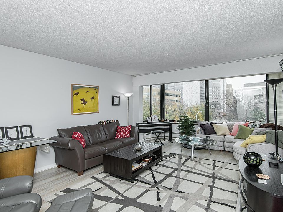 This beautifully maintained 2-bed, 2-bath corner unit condo offers a fantastic low-maintenance lifestyle! You'll love the updated kitchen featuring granite countertops and soft-close cabinets. The open living areas boast attractive laminate flooring and offer pleasant city views. Both bedrooms are generously sized and include plenty of closet space. The community amenities are excellent, including an indoor heated pool, exercise room, patio with a grill, library, kitchenette, and convenient on-site laundry. You'll also appreciate the underground heated garage with an assigned parking spot conveniently located near the elevator. The HOA covers all utilities except for electricity. The location is ideal, providing easy access to everything downtown has to offer, such as restaurants, shopping, the clinic, and the subway system.