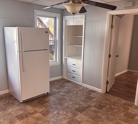 Beautiful 1 bedroom first floor apartment. Full tub & shower. Ceiling fans in kitchen, bedroom and living room. Plenty of closet space. Off-street parking available for one car only. Hot water included in rent. Heat and electric are separate. Need 3 months rent up front for first, last and security. Apt is move-in ready.Very desirable location. Close access to many groceries, shops, banks and restaurants. Off-street parking. Landlord provides landscaping and plowing/shoveling.