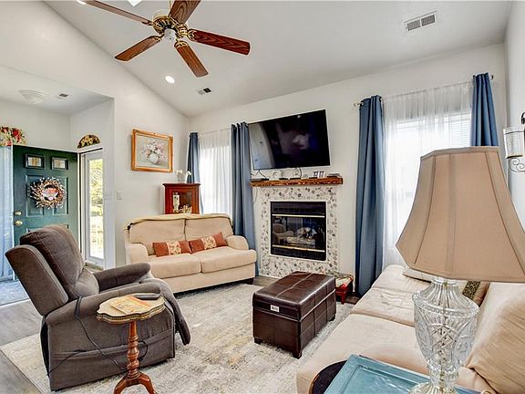 This beautiful waterfront townhouse features an open and bright floor plan with high ceilings, skylights, and primary suites on both floors. Paint, flooring, kitchen countertops, fixtures, skylights, and fireplace surround all done in the last two years. There is ample closet space, vaulted ceilings, and two reserved parking spaces just as you enter the parking lot. The charming enclosed patio is perfect for early morning coffee or peaceful evenings under the stars. Community amenities include pool, clubhouse, tennis courts, walking trails, and playgrounds. Perfect location for shopping and restaurants. Easy access to highways and bases.