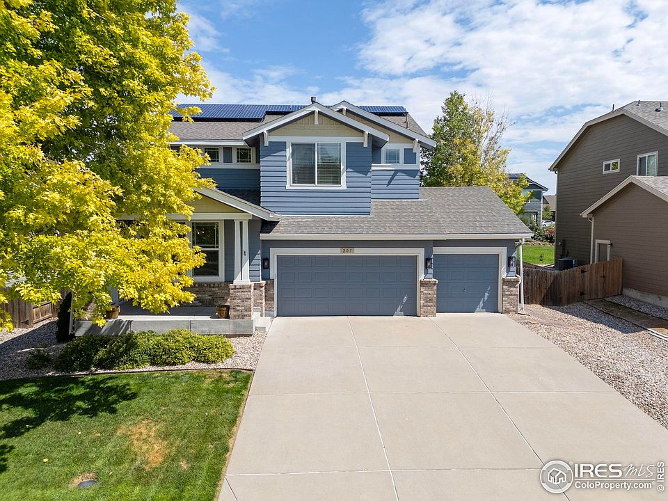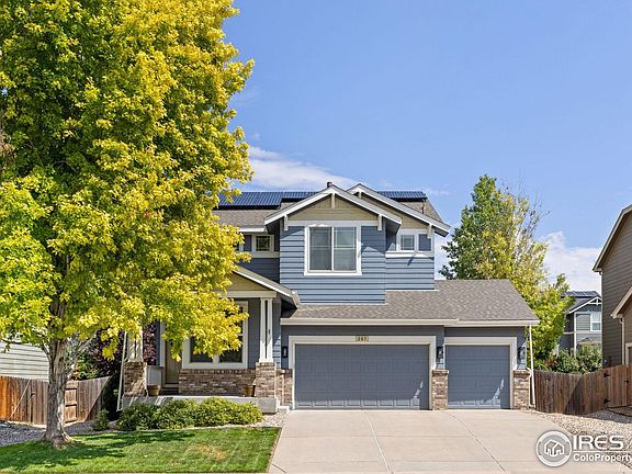 Welcome to this beautifully upgraded 4-bed, 3.5-bath home in the highly sought-after Pioneer Ridge neighborhood of Johnstown. With over $60,000 in upgrades, this home offers modern living and thoughtful design throughout. The finished basement is a true highlight, complete with custom finishes including a wet bar, gym area, luxurious bathroom, bedroom, and spacious family room, perfect for entertaining or hosting guests. Upstairs, the large primary retreat features stunning mountain views, a spa-like bathroom with a relaxing soaking tub, and a generous walk-in closet. Multiple family rooms across every level provide versatile spaces for gathering or quiet relaxation. Step outside to enjoy the gorgeous backyard, designed with mature trees, towering lilac bushes, raised garden beds, and a stamped concrete patio-an ideal setting for outdoor dining or unwinding in your private oasis. The oversized 3-car garage provides plenty of room for vehicles, storage, or hobbies, and the paid-off solar system offers the added benefit of energy efficiency and savings. Nestled in a fantastic neighborhood, you'll appreciate being within walking distance to Pioneer Ridge Elementary and multiple parks, including Pioneer Ridge Park with playgrounds, picnic shelters, and a disc golf course. The community is known for its tree-lined streets and welcoming atmosphere, all while being just a short drive to charming downtown Johnstown with shops, dining, and local conveniences. This home combines luxury finishes, functional living spaces, mountain views, a paid-off solar system, and a vibrant neighborhood, making it the perfect place to put down roots.