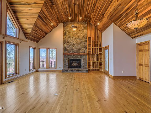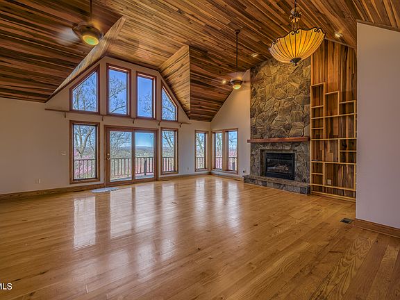 Live like you are on vacation all year long, nestled from the top of your private ridge with long-range views in all directions. Located in one of the TriCities most desirable areas in the heart of Gray, TN, is this stunning chalet-style home. This custom-built home offers 3 bedrooms and 3.5 baths with over 2800 sq ft of living space on 4.15 acres of privacy in an ultra-convenient location. You will love the large open family room with vaulted tongue and groove adorning the ceilings, as well as a stone fireplace designed to take in the views in all directions. All the finished woodwork in this home was harvested and milled from the property (floors, ceilings, window and door trim, and cabinets from poplar, cherry, oak and hickory. The efficient galley style kitchen works well and opens to a lovely breakfast nook perched in the tree tops. A lovely screened porch adjoins the breakfast nook, taking in even more breathtaking views, including the sunrise. The large main-level primary suite is a restful oasis at the end of the day with a private bath, large jetted tub, separate shower, and a big walk-in closet. Access the vast wrap-around deck from the primary suite, main living area, and screened porch for the gorgeous sunsets the home takes in every evening: the guest powder room and large laundry round out the main level. Travel upstairs to find 2 well-appointed guest rooms, a full bath, and a bonus room that could serve as an office, playroom, or 4th bedroom if needed. The full unfinished daylight basement offers an additional 1580 sq ft of space for storage and a workshop, or it could be finished for an additional living area. A full bath is already in place in the basement, offering tons of potential. A new septic system has recently been installed. This home is truly a rare find and perfect for those seeking solitude, amazing views, and convenience all in one package. Minutes to shopping, dining, schools, and entertainment. Buyer/Buyer's Agent to verify all