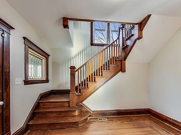 Prepare to be impressed! This 4 bedroom victorian style home is beautifully remodeled, sits on a corner lot, and is walking distance to downtown Frankfort. As you enter the foyer you will be in awe of the beautiful woodwork and grand staircase. The floor plan is spacious and open throughout the main level which is something you wouldn't normally find in this style of home. The remodeled kitchen is light and bright with white shaker style cabinetry. Stainless steel appliances, granite countertops and a breakfast nook that is perfect for that morning cup of coffee. Massive dining/living area with a cozy brick fireplace and french doors that lead out to the deck. A mud room area and a 3 quarter bathroom complete the 1st floor. The grand staircase will take you to the 2nd level where you will find 4 bedrooms with one having its own set of stairs that leads up to a third floor expansive loft. The loft is open to below with plush carpeting perfect for a den, workout area, or playroom. There is also rough plumbing in the loft for a wet bar. Fresh paint and updated lighting throughout along with an unfinished basement with plenty of storage. Attached barn style 2 car heated garage big enough for all of your toys and maybe even an RV! Newer Windows. Newer roof, HVAC system, plumbing and electrical. Charming covered front porch complete with a swing. Walking distance to shops, restaurants, and Old Plank Trail! Welcome home!
