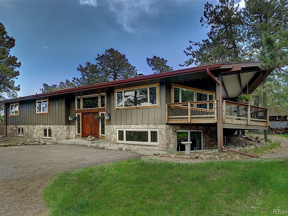 Enjoy country living on this 2 acre fenced/gated horse property zoned A-2 with views on a domestic well (ability to water livestock and irrigate up to 1 acre). No HOA and in great commute zone in the highly sought after Soda Creek area within the Jeffco school district and 5 minutes to North Evergreen amenities. This 2 story 3600+ sf 1970 build has been completely updated and meticulously maintained. Offering 4 bedrooms, 4 baths, 2 car attached garage, plus 1500 sf detached barn/shop with pellet stove (fits 4 vehicles), 3 stall barn with covered breezeway, greenhouse, playhouse & garden shed. Daylight basement with large windows, electric fireplace, kitchenette, laundry, huge great room as well as a bedroom adjacent a bathroom with a separate entrance offering options for generational living. Yes! you can keep chickens here. There is also an apiary in place with electric fencing for beekeeping. Fresh paint inside and wood floors on main and stunning front door have just been sanded & refinished. New septic tanks and leach field in 2023. Wood, laminate and tile floors, gourmet kitchen, and main floor master with laundry. Disability access with optional ramp, this home has large sliding doors and 5' hallways for ease of access and moving furniture. Bring your critters, main floor has doggie door opening onto south facing covered deck. Perennials abound and there is a composite deck and flagstone patio for entertaining. This unique property is a rare find in North Evergreen with wonderful access to I-70, within 1000 feet of Fire Station #7 as well as a fire hydrant for your insurance discount. Leased solar panels in place and recent utility information is available upon request. Pease schedule your showing today through Broker Bay.
