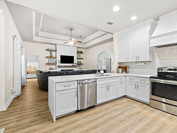 Discover the perfect blend of modern updates and coastal charm at 207 Lullaby Loop, located in the desirable short-term rental-restricted neighborhood of Whispering Lake in Santa Rosa Beach. This inviting residence offers a freshly painted exterior and boasts three bedrooms, two bathrooms, and 1,823 square feet of thoughtfully designed living space. As you enter, you'll be greeted by an elegant entryway featuring stylish board and batten accents and newly installed LVP flooring that set the tone for the rest of the home. The open-concept living area is warm and welcoming with a newly added fireplace and built-in storage, highlighted by natural light that enhances the home's inviting atmosphere. The beautifully renovated kitchen is a chef's dream, showcasing sleek backsplash tile, custom hood and an extended peninsula with waterfall quartz countertops. It seamlessly connects to the open dining and living areas, making it ideal for both daily living and entertaining. The master suite is a serene retreat, complete with a custom-designed closet that provides ample storage and organization. The en-suite bathroom offers a relaxing space with dual vanities, a soaking tub and walk-in shower. Two additional guest suites, one with vaulted ceilings, share a full renovated bathroom. Outside, enjoy the tranquility of your large backyard with wooded views, which is fully fenced for added privacy. The screened-in back porch extends your living space outdoors, providing a perfect spot for morning coffee, evening relaxation, or alfresco dining. Located in the peaceful Whispering Lake community, you'll appreciate the sense of community and the convenience of nearby amenities including nearby shopping and dining of Grand Boulevard and Silver Sands Premium Outlets along with the beaches, shopping and dining of Scenic Highway 30A.