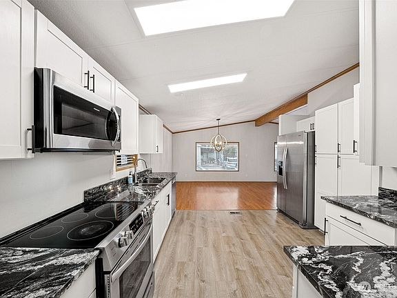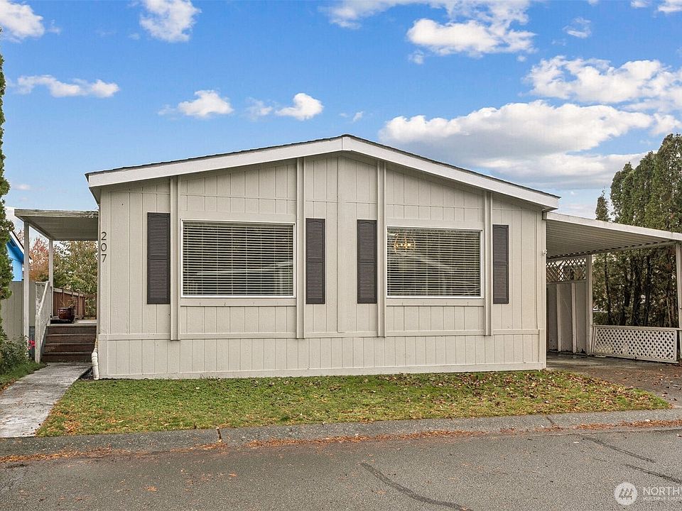 Lovely 2Bed/2Bath remodeled home located in the all-ages community of Mountain Meadows Park. A gourmet kitchen steals the show w/ tasteful white shaker cabinets, granite countertops, and stainless steel appliances. Enjoy an open floor plan w/ vaulted ceilings & durable laminate flooring throughout. Primary suite offers a five-piece bathroom & walk-in closet. Updated second bath w/ quality finishes. Oversized utility room. Attached 2-car carport w/ dedicated storage space. Good-sized fenced backyard. Updated plumbing, wiring & hot water heater. AC for year-round comfort. Desirable neighborhood w/ a private park & clubhouse - all within steps of the Foothills Trail, local schools & charming downtown Enumclaw. This is affordability with style!