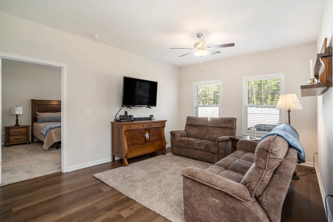 Upgraded landscapingGuest bedroomStylish backsplashWelcoming hallwayPrivate primary suiteFenced backyardGranite-topped vanity