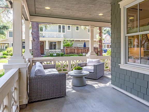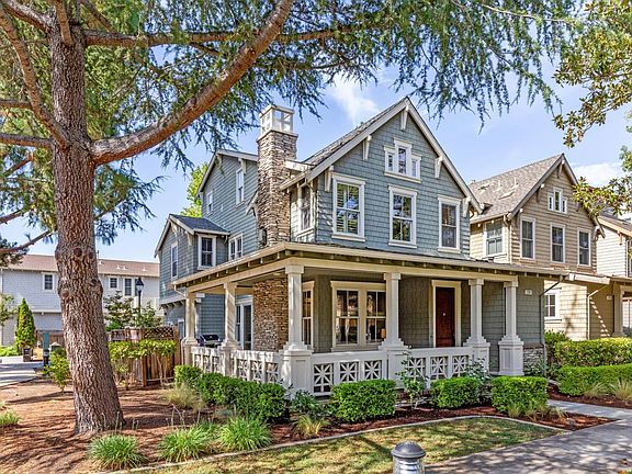This Craftsman-style home stands at a premier corner location in Morgan Lane, a community of 56 single-family homes built in 2008 by Taylor Morrison. Overlooking the tree-lined central park, the home enjoys a setting that feels open to green space while offering the rare advantage of a large wraparound porch. Beautifully finished with lighting & detailed railings, this inviting outdoor area extends the living environment & sets the tone for the home's welcoming character. The three-level design offers versatility & thoughtfully arranged to accommodate a variety of lifestyle needs. Main level showcases a spacious living & dining area with fireplace & elevated counter seating that separates the area from the kitchen. Beautiful honed granite counters & to-the-ceiling tile backsplashes contrast with crisp white cabinetry & an array of quality stainless steel appliances, including a 6-burner gas range & built-in refrigerator. Second level with new carpet. Primary suite features all customized closets, & Carrara marble bath. Top floor provides a full loft-style suite with customized cabinetry & workstation, & with its own bath. Adding to the home's appeal is its Linfield Oaks location with convenience to Burgess Park, downtown Palo Alto, Meta headquarters, & top Menlo Park schools.
