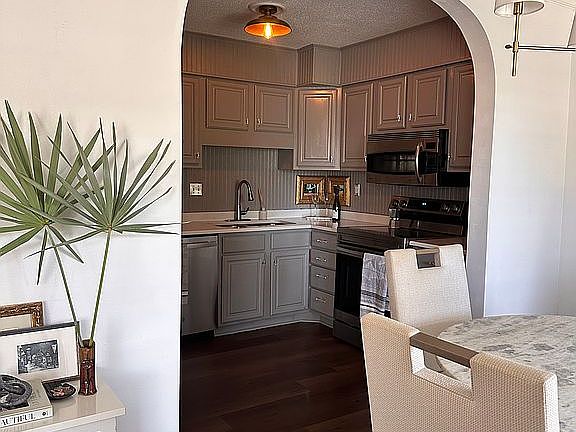 Fresh paintCharming archNew stainless appliancesGranite countersAbundant cabinet spaceLarge closetsRelaxing courtyard