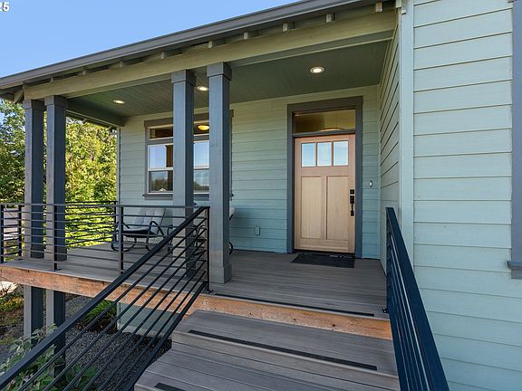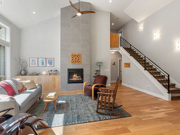 Set on a quiet cul-de-sac across from the Indian Creek Trail, this 2018 custom-built Hood River home offers 3 bedrooms, 2.5 bathrooms, an office, and 2,076 sq ft of light-filled living space. The great room, with vaulted ceilings, a wall of south-facing windows, and a dramatic floor-to-ceiling tiled fireplace, connects seamlessly to the dining room and kitchen. The spacious primary suite features vaulted ceilings, a walk-in shower, dual sinks, and a soaking tub, creating a private retreat. Outdoor living is highlighted by a backyard garden oasis, multiple decks, raised garden beds, mature landscaping with drip irrigation system, and a welcoming covered front porch. Solar panels (owned) and an on-demand hot water heater enhance energy efficiency, and the garage includes an art studio with utility sink and ample storage. Loved by its original owner for its brightness, sense of space, storage space, and peaceful setting, this home offers Mt. Adams views, trail access, and exceptional privacy in a desirable location. This is a home you won't want to miss; contact an agent to set up a private showing of this lovely home.