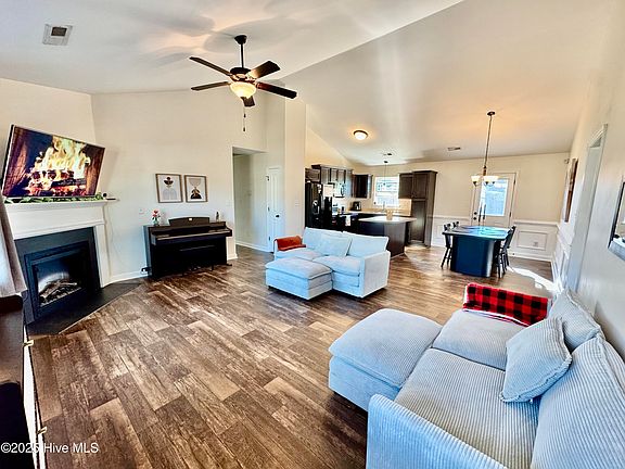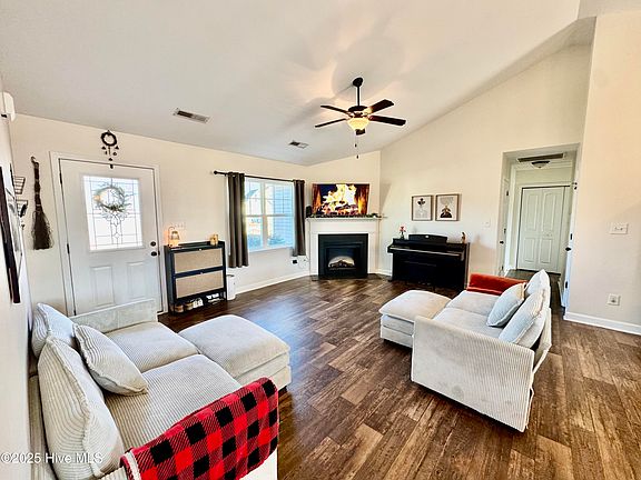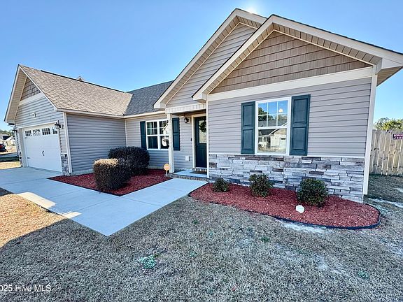 Welcome to Eastport, one of Hubert's newer subdivisions! Are you ready to find your happy place? Look no further! This well-maintained, gorgeous home is looking for its second owner! As you arrive, you'll fall in love with the curb appeal & want to create your own personal oasis in the large back yard with a privacy fence. Upon entering, you'll feel right at home in the cozy living room, with a fireplace, that flows right into the kitchen and dining room. The kitchen offers plenty of cabinet & counter-top space allowing the chef to still be a part of the conversation in the great room. The primary bedroom has a tray ceiling and an on-suite bath with double sinks and a bathtub that is great for a little R&R. Worried about closet/storage space? Don't be, the primary suite offers two walk-in closets in addition to the entire home offering ample storage throughout. The home also boasts two additional bedrooms, one additional full bath, and an attached spacious two car garage. The kitchen comes fully equipped with appliances and the current owners are also throwing in a matching, modern washer/dryer set AND a security system! BONUS!!! This home is a showstopper that you do not want to miss out on! Do not be shy...come on by and fall in love with this marvelous home before it gets scooped up!!