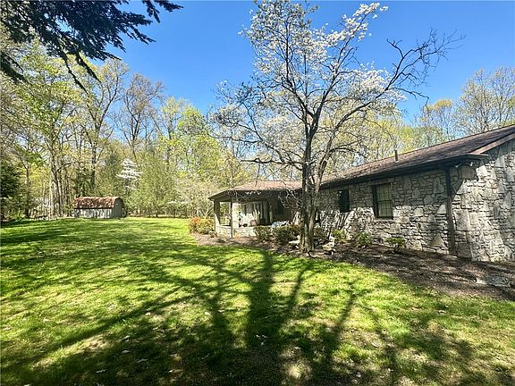 Country charm awaits in this custom designed & built, hand picked local mountain stone home! Sitting on 7.8 +/- secluded acres, this 2 bedroom / 1.5 bath ranch is centrally located and minutes away from Route 30 shopping. Live comfortably on the main level which features no stairs, a laundry room, formal living + dining rooms and a 2-car garage in addition to the bedrooms and bathrooms. The first floor also features a stone fireplace wall that extends into the country oak kitchen with hardwood floors, copper range hood and a center island. The basement features two large living areas (yes, 2!), a cedar closet and lots of extra storage. Outside you’ll be surrounded by nature and can sit, relax and enjoy the peace and quiet on either of the covered porches. The home also features a long paved driveway for added privacy.