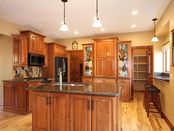Beautiful Fontenelle Hills custom built home boasts a stunningly landscaped rear yard with waterfall. Custom cherry cabinets and solid raised panel doors throughout. Lots of granite, hickory and tile floors, and spacious rooms. Beautiful owner's bedroom suite has den connected and large bathroom with heated slate floor, walk-in shower, and huge closet. Large family room in basement has fireplace and wine cellar. Home has been well-maintained and is ready for immediate occupancy. Ask about VA assumable mortgage.