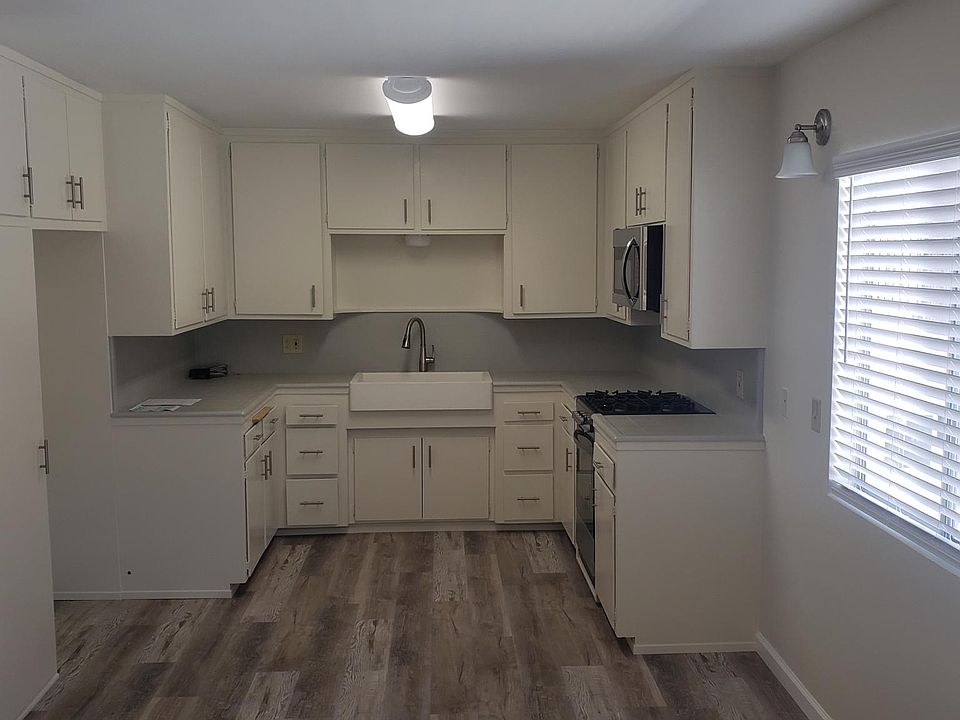 Upper, back unit of 2 story, 7 unit apartment building. Near fully remodeled less than 2 years ago. Close walk to El Segundo beach or downtown dining. New flooring (hardwood in living, kitchen, bath ; carpet in bedrooms). Stainless steel appliances (microwave, oven, refrigerator). Comes with 1 covered, carport spot. Laundry room on site ($1 per cycle). No pets please. Owner pays water and trash. Tenant pays gas and electric.