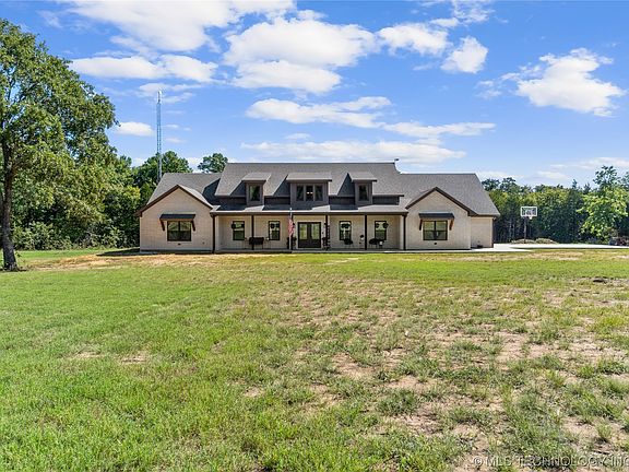 Explore this NEW 2023 build, nestled in Portman Subdivision in Silo, OK. Property offers OVER 5.5 ACRES & is a perfect blend of modern luxury and rustic charm. Beautiful stained concrete flooring that looks fabulous but also incredibly easy to clean. The large primary bedroom is a true retreat, complete with a walk-in closet that conveniently connects to the laundry room. The master bathroom features a luxurious soaker tub & a spacious tiled shower with a rainhead. Enjoy a jack & jill bathroom set up between two of the bedrooms & an oversized bathroom adjacent to a bedroom, especially covenant for additional guests. For entertaining, the wet bar off the kitchen comes complete with a wine fridge. For safety, don't miss the safe room/storm shelter closet in the secondary bedroom. Kitchen features a gorgeous 8-burner gas range, all soft close and under cabinet lighting, an oversized walk-in pantry, and a roll out window over the sink that offers a picturesque view of the backyard. Speaking of backyard, get ready to be mesmerized by the wildlife that visits – we spotted eight deer just this morning! Dreaming of a pool or a shop? The electrical box is already wired and ready to make your dreams come true, in addition to a half bathroom conveniently located off the back porch. Work from home with your own internet tower, hardwire and wireless internet at your fingertips. House and garage is spray foamed insulated and features an additional office area through the garage, which is heated & cooled with a beautiful front view. Some other amazing additions are: two tankless water heaters, two attic accesses, two HVAC units, 4 exterior water spigots, countless indoor and outdoor outlets, french drains, wifi thermostats, wood burning outdoor fireplace, security cameras, exterior propane hookup for grilling, & uplighting on the front exterior, fulfilling ALL your needs. This property is paradise.