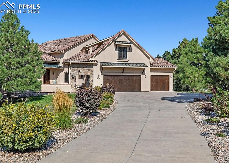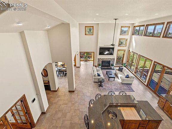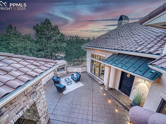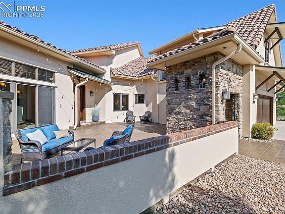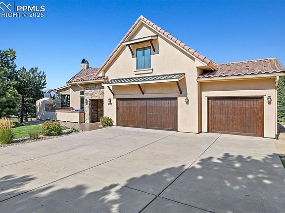 Spectacular Custom home w/ unobstructed views of Pikes Peak and Front Range. Rare location near Voyager & Interquest w/ a private country feel. Gorgeous curb appeal w/ stucco & stone, wood beams, iron gate, concrete tile roof, and front courtyard w/ fireplace. Open floor plan w/ soaring ceilings, oversized tile flooring, incredible mtn views, formal dining, sun room, loads of natural light, executive office w/ built ins, & gas fireplace. Gourmet kitchen features high level granite counters, solid alder cabinets w/ hardware, designer tile backsplash, Bosch appliances, built in butcher block cutting board, 2nd prep sink w/ disposal, trimmed out imperial range hood, & Viking gas range. Master suite features Karastan Luxury Kashmere nylon carpet with ½ inch 8-lb moisture barrier padding & mtn views. Attached 5 piece bath w/ hydromassage tub, spa walk in shower w/ rain head, tile flooring, separate sinks, and large walk in closet with his/her sides. Staircase w/ wrought iron spindles and custom trim work. Upper level boasts large open loft open to main level & an amazing bunk room w/ balcony. Every bedroom has an attached bathroom except for basement! Large walk out basement features wet bar, newer lvp flooring, & more mtn views! Backyard is perfect for entertaining w/ large multi-level stamped concrete patio, stone walls, iron railings, turf play set area, and loads of space. Kolbe windows and doors throughout. High end radiant heating system. Two Quiet Cool whole house fans for the house & one for the garage. Large main level laundry w/ 2nd hook up in basement. Large storage room! Oversized 3 car garage. MonierLife tile roof. Hunter Douglass window shades (some remote controlled). Newer well pump. Incredibly rare and valuable location. County land so no rules on short term renting for extra income! Pride of ownership doesn't begin to tell the story. Must see in person!