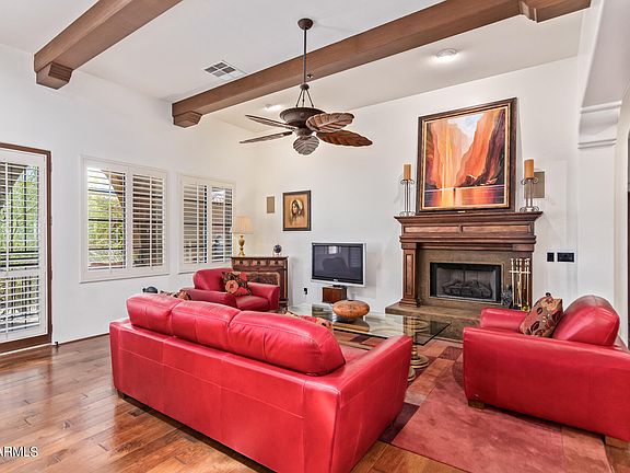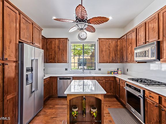 Come see this quiet and gorgeous Single-Story End Unit Townhome today!! As you enter, notice the beautiful beams in the great room as well as hardwood flooring and a cozy fireplace. The chef's kitchen features new quartz counter tops, new KitchenAid SS appliances, quartz back splash and a center island. The roomy master has its own walk-in closet and spa like ensuite boasting double sinks, walk-in shower and luxurious tub, perfect for relaxing after a hard day at work. This townhome has a second bedroom for your guests and a den for your home office. You can enjoy endless blue skies and lush desert scenery from your back patio. The community pool is located across the street and you are a short walk to the famous Market Street with a variety of restaurants, shops and a grocery store. This townhome is located in the heart of DC Ranch which has many community amenities including 2 community centers, a fitness center, a large heated pool and spa, basketball courts, tennis courts, pickleball courts, playgrounds, walking and biking trails. With picturesque views of the McDowell Mountains and convenient proximity to hiking trails and outdoor recreation, this is the epitome of resort-style living. Don't miss this opportunity to experience luxury living at its finest in the Courtyards at DC Ranch.