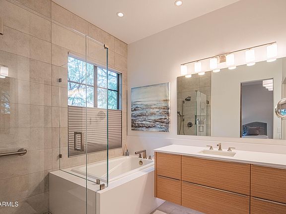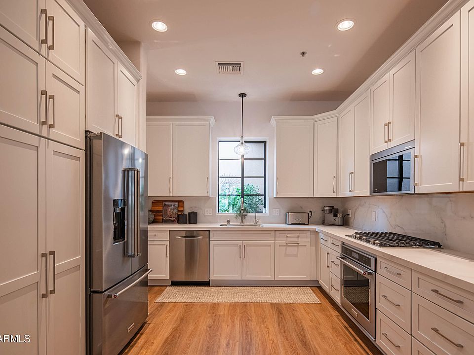 An exceptional single-level condo in the prestigious DC Ranch has been flawlessly updated with custom finishes throughout. The newly remodeled kitchen boasts custom cabinetry, marble look quartz counter & backsplash, & high-end appliances. Custom window treatments, master closet and laundry room workstation were just completed. New plank flooring complements the gorgeous, refaced fireplace. Perfectly positioned across from the community pool and spa, and just a short walk to the vibrant Market Street, offering premier dining, shopping, and entertainment. Enjoy immediate access to scenic trails and a wealth of amenities, including a new fitness center, tennis, pickleball, and more. See remodel details under documents tab for list of all upgrades! Homes like this are a rare find!