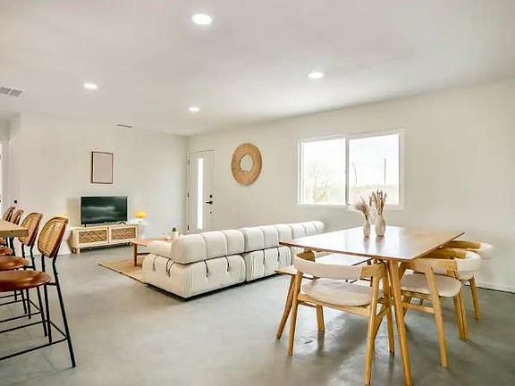 This impeccably renovated desert homestead is a three bedroom, two bath home on 2 acres separated by a fully fence. This house sits atop a slope in North Joshua Tree where you can take in sweeping and uninterrupted desert views. This property embodies elegance through simplicity. This property has exposed concrete floors and an open living/dining space. Enjoy your sunrise with coffee on the covered back porch and end your day there watching the sunset over the west. This fully renovated house comes with two new custom tiled bathrooms, a well appointed kitchen with a gas stove, new double pane windows, and new interior and exterior paint. A perfect desert cabin that allows you to escape, but with all of the desired comforts that one needs.