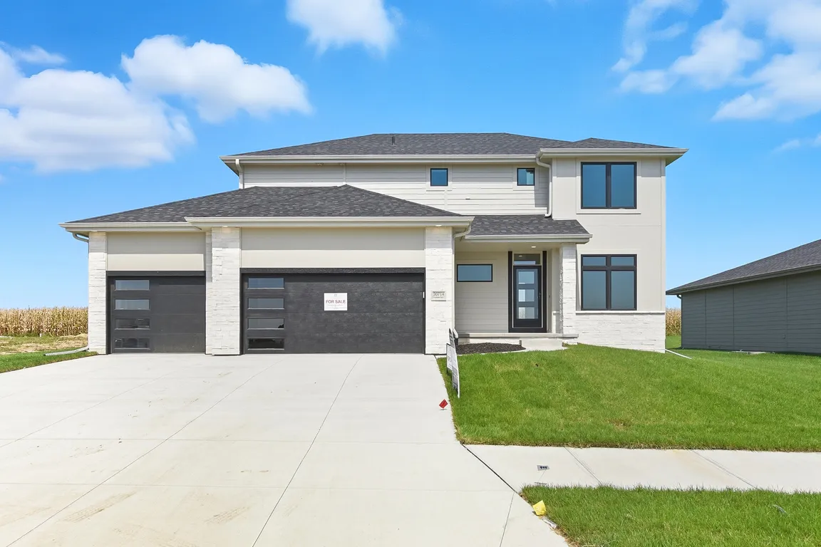 Covered patioWalk-in showerSpacious kitchenSpacious mudroomDouble sinksModern elevationLuxurious quartz countertops
