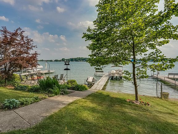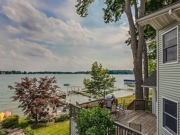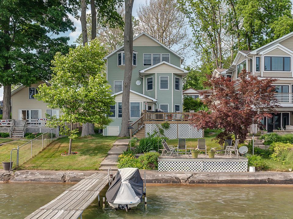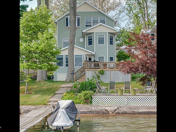 4 BD 4 BA 2 half-BA, 3,792-sq-ft 3-story home, Diamond Lake north shore, great views. Recently remodeled for open-concept feel and flow. Main: Sunroom w/ upper deck access; sitting room w/ 3-sided lake views; kitchen w/ stainless appliances, granite counters, British AGA stove/oven; LR w/ gas fireplace; DR; half-BA w/ laundry. Second floor: 2 BD w/ ensuite BA, 3rd BD, 3rd BA; office space. Third floor: Master suite and sitting area w/ bath with dual vanity, walk-in closet, wet bar, half-BA w/ laundry, bay window. Hardwood floors, ceiling fans, built-in shelves. Waterside deck, seawall, private dock (4-ft water at end). Street-side terraced yard, garden, 2-level pond, waterfall, sheltered patio, long 2-car detached garage for storage, storage under deck and sunroom.
