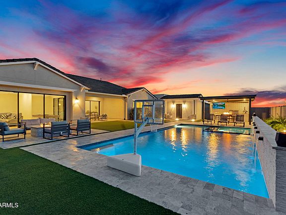 Positioned on a private and peaceful corner lot, the home makes a grand first impression with immaculate curb appeal and timeless architectural detail. Step inside to soaring ceilings, expansive living spaces, and a flood of natural light that accentuates the home's elevated finishes. Every inch has been thoughtfully designed, with luxury upgrades throughout and an ideal layout for both everyday living and sophisticated entertaining. The gourmet kitchen is the centerpiece of the home, featuring top-of-the-line appliances, custom cabinetry, and elegant stone surfaces. The private casita offers an upscale retreat for guests, while the lavish primary suite boasts two oversized walk-in closets and a spa-inspired bath. Step through a dramatic 4-panel glass slider that opens fully to reveal an expansive backyard oasis. Two additional glass slider panels in the game room further elevate the seamless indoor-outdoor living lifestyle. Outdoors, the resort-style backyard is an entertainer's dream with lush landscaping, a sparkling pool, and a dedicated pool bath with a walk-in shower. Set within an exclusive single-level community centered around a beautiful central park, this home is truly the epitome of luxury living in Queen Creek.