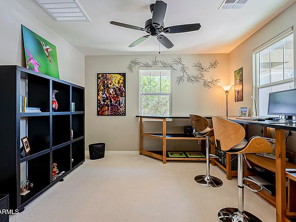 Tree-lined streets, parks, & sunsets above the White Tank Mountains greet you from your new home! Ample patios grace this spacious bungalow. The open-concept living area features a gourmet kitchen with espresso stained cabinets & contemporary granite counters. Stainless steel appliances includes gas cooktop, double ovens, dishwasher, refrigerator, single undermount sink & reverse osmosis, microwave, walk-in pantry. Light, bright family room overlooks the back patio, putting green, & shady trees. Private, split master suite features upgraded garden tub, separate shower, double vanity, walk-in closet. 3rd bedroom is currently used as a den with frosted double French doors. Upgraded lights, fans, tasteful trim and neutral tones make this home move-in ready.