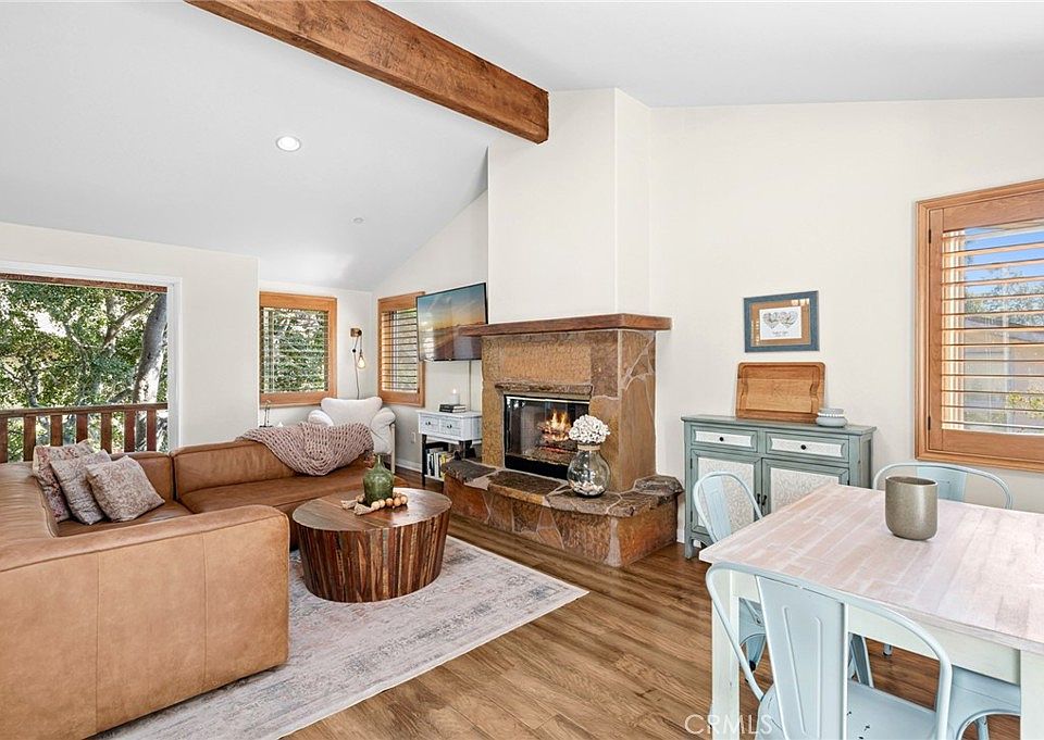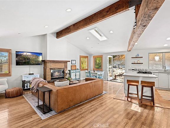 With three bedrooms and two bathrooms, the layout is designed for both comfort and flexibility. Two generously sized bedrooms and a full bath are located on the lower level, along with an oversized laundry room/office. Upstairs, the private primary suite features a skylight, walk-in closet, and an adjoining bathroom with dual sinks and a shower-tub combo. The upper level offers an open floor plan including the kitchen and a light-filled living room with high beamed ceilings, offering privacy and serenity.