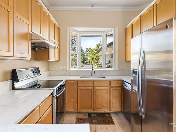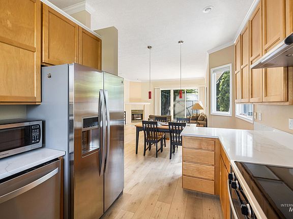 Cozy fireplaceBright open floorplanStunning quartz countertopsFarmhouse sinkStylish metal pergolaPrivate laneNew dishwasher