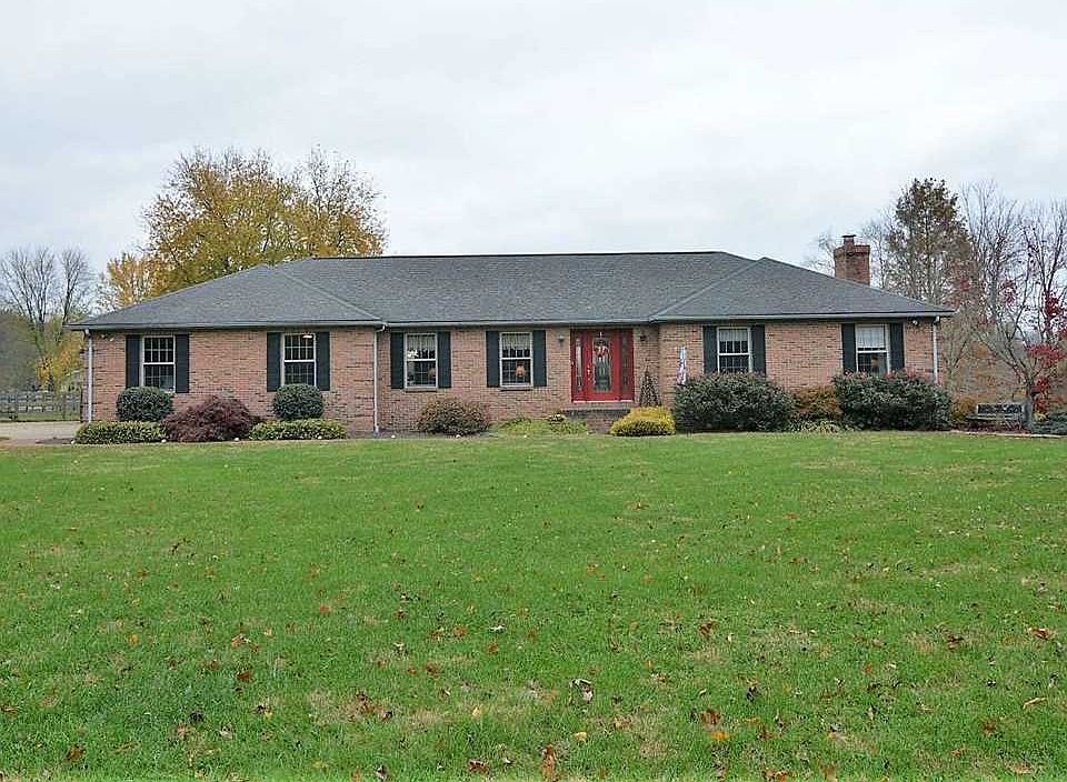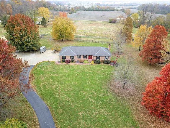 Here is your Mini Farm along with a Great Ranch style home and walk out finished basement. Along with the Red Doors, that you will notice from the road, you will be taken with the setting of this property. Current owners have 2 horses that have their own stalls in a most impressive barn as well as their own riding arena, 4 dogs with their own fenced domain, a 1 pig named Francis (not included in purchase) and has his own personality and likes to eat anything but especially sweets. Don't worry you don't have to own animals to love this property. Enter the front door and you will instantly be wowed by the large foyer with wood flooring as well as the sunken living room that can more than accomodate a large gathering. The master bedroom is large in size and comes with it's own master bath You will also find 2 additional bedrooms on the main level. The partially finished basement provides you with a huge family room with fireplace, 4th bedroom and full bath as well as your 13' long laundry room and a workshop that is 33 x 20 and walks up to a 3 car garage. Home comes with a $585 2-10 Premium Home Buyer's Warranty, Septic that was replaced in 2005, Solid 6 panel wood doors, Horse barn, and pole barn. Also included in purchase is an $11,000 allowance for a New Roof. Sellers are providing a roof estimate from Lutz Bros in Haubstadt .