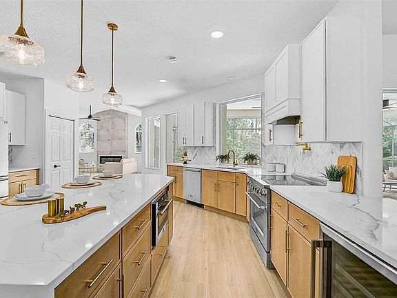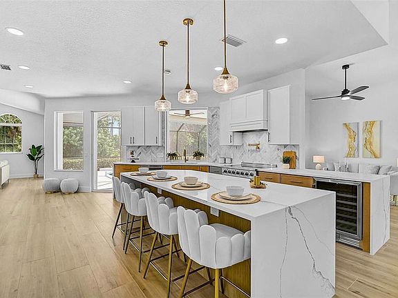 Welcome to your dream home in the highly desirable gated Calusa Lakes Golf Club community in Nokomis, Florida. This brand new, top to bottom meticulously gut-renovated, 4-bedroom, 2.5-bathroom single-family residence spans 2,578 square feet, and showcases precisely curated design throughout. The home features a private pool, and hurricane shutters for added peace of mind. Step inside to custom tile flooring that flows seamlessly throughout the home. The gourmet kitchen, designed with precision, boasts quartz countertops, premium top-of-the-line appliances including a wine refrigerator, custom wood cabinetry, marble backsplash, and a convenient pot filler for effortless cooking. The adjacent family room creates a warm ambiance with an electric insert fireplace, perfect for cozy evenings. The primary suite is a private oasis overlooking the sparkling pool, complete with custom wood shelving in the spacious walk-in closets. The spa-inspired primary bathroom, crafted with meticulous attention to detail, features quartz countertops, a large walk-in shower, a separate soaking tub, and a towel warmer for added comfort and luxury. The outdoor pool area is designed for seamless entertaining, with ample under-roof space for al fresco dining and relaxation, all set on a highly private lot that ensures peace and seclusion. The two-car garage is enhanced with a split AC system and epoxy-finished flooring, providing a polished and comfortable space. Located in the sought-after Calusa Lakes community, enjoy low HOA fees of $327 quarterly, no CDD fees, tennis courts, and the flexibility of optional membership to the semi-private 18-hole golf course- no obligation to join. Perfectly positioned off I-75 (Exit 195) and Tamiami Trail, this home is minutes from Nokomis Beach, Siesta Key, and the vibrant dining, shopping, and cultural scenes of Venice and Sarasota. This exquisite home blends modern elegance, meticulously considered renovations, storm-ready features, and an unbeatable location. Schedule your private tour today!