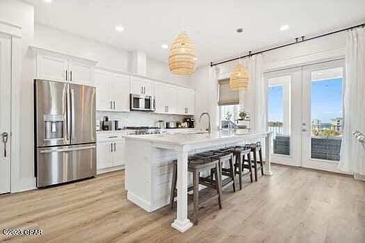 Enter the third floor into an inviting open Dining, Kitchen and Family room. Stainless steel appliances include a built-in microwave, refrigerator-freezer, gas stove, electric oven and dishwasher. The shiplapped dining area provides seating for ten along with a beautiful island complete with seating for four. Double glass doors exit the kitchen providing a stunning panoramic gulf view opening onto a covered porch with a stainless steel natural gas grill. The third floor family area overlooks the pool.