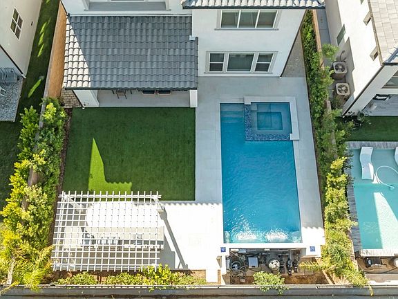 The resort-style backyard not only has a spa and sparkling pool with a waterfall, but there is