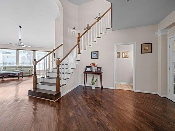 Gas fireplaceWood floorsPrivate backyard retreatUpstairs offers three bedroomsWaterfall featureLarge bathFormal dining