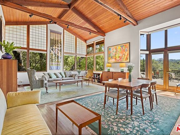 Charming Topanga Retreat lovingly built 56 years ago and first time on the market! Tucked away on a quiet road, this stunning two-story home offers panoramic views of the Topanga Mountains and over an acre of lush, established gardens. The entry level features three bedrooms, including a spacious primary suite, a full mid century bathroom, and a large laundry room with ample storage. Upstairs, enjoy an open-concept living and kitchen area filled with natural light and views of surrounding oak trees. Step out onto the expansive entertainment deck perfect for gatherings or quiet afternoons surrounded by nature. A detached garage/workshop and peaceful garden paths lined with native plants like Jerusalem Sage and California poppies complete this rare Topanga gem. Don't miss your chance to own a truly special property!