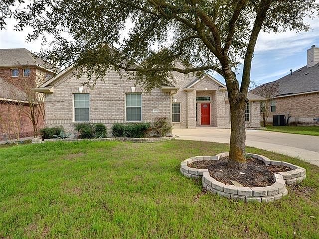 1 block to HOA park with 2 pools, 2 playgrounds, basketball. Beautiful wood floors, hard tile, new carpet in bedroom. Fresh paint. High ceilings, kitchen open to living and breakfast. Slab granite counters. Mother in law floorplan. Master has garden tub, separate shower , double vanity, 2 walk in closets! Formal dining and living. Fridge, washer , dryer, water softener provided. Gas log fireplace. Huge tiled patio, privacy fenced, pets under 50 pounds welcome. Gas service, city of Pflugerville water.