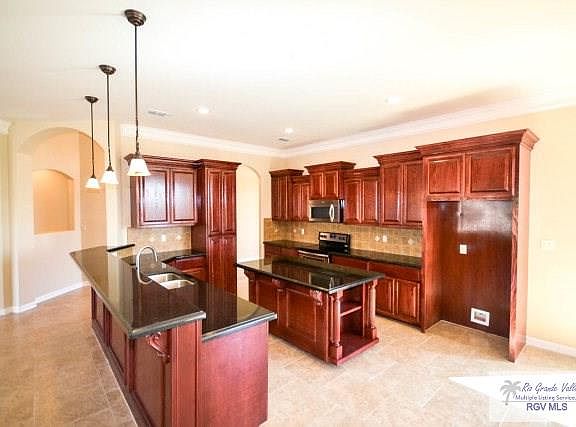 Windstorm Certified! Superb quality and sophistication from its high decorative ceiling to its arched entry is what you get on this gorgeous home. The huge new modern open area includes a spacious kitchen with a heavy supply of custom built cabinets with pullout drawers, stainless steel appliances and awesome center island. All 4 bedrooms are spacious with neutral colors. Many of the extras are safety fire blocking, hard-wired fire alarms, tamper resistant wall plugs, windstorm detectors, windstorm protected garage door, custom doors, convenient tv connections in all the bedrooms and the patio. Back patio has stone BBQ pit with granite sink, dusk to dawn outside lights, full privacy fence. Also well-fed sprinkler system to include bubblers on all trees and shrubs in the front.