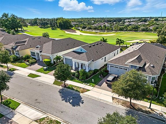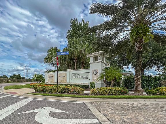 Welcome to resort-style living in the Four Seasons 55+ guard-gated community. This upgraded St. Lucia model blends coastal elegance with the Parrot-Head lifestyle in the open living space. Features include wood-look tile, 8’ doors, tray ceilings, designer lighting and fans. Split-bedroom plan ensures guest privacy. Expanded, builder-upgraded great room with dry bar is ideal for entertaining. Gourmet kitchen offers granite island, soft-close cabinets, GE Profile appliances, gas cooktop, vent hood, and LG refrigerator. Primary suite features golf course views, tray ceiling, and spa-style bath with dual-head shower, double vanity, and walk-in closet. Enjoy morning rocket launches from the front porch and amazing sunsets from the back covered lanai and fenced yard. HOA covers lawn care and irrigation. Amenities: clubhouses, pools, spa, tennis, pickleball, fitness center, and full-time activities director. Easy access to Disney World, Celebration, Universal, shopping, dining, and major routes to Orlando and Tampa airports, and both coasts. Seller is a licensed Florida Realtor.