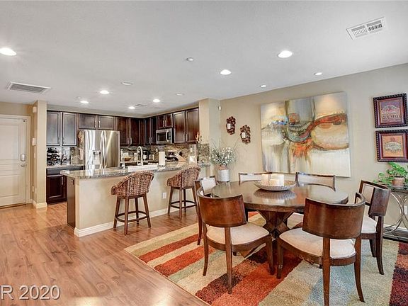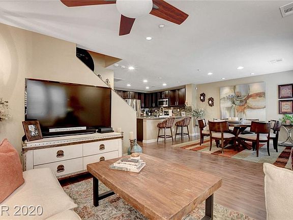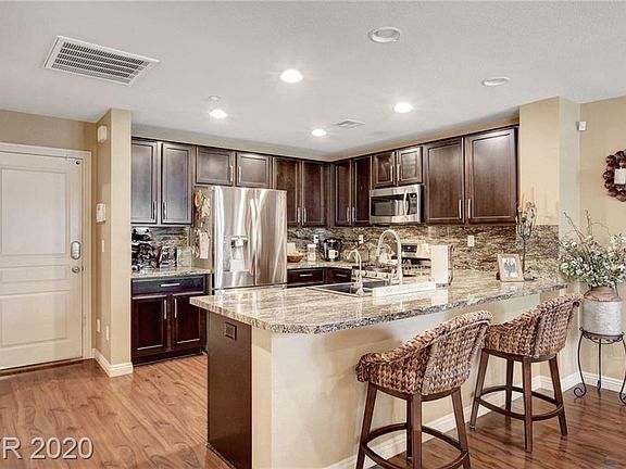 UPGRADED townhome in Inspirada. Open concept living features EXTRA LARGE countertops stone countertops, stainless steel appliances, and walk in pantry. Beautiful laminate flooring downstairs, upgraded light fixtures. Large storage closet under the stairs. Upstairs Laundry Room, with a inviting Master Suite with walk-in custom closet and upgraded Master Bathroom. Shutters throughout, central vac, water softener, custom cabinets in garage and epoxy