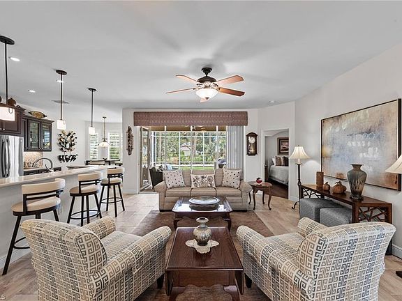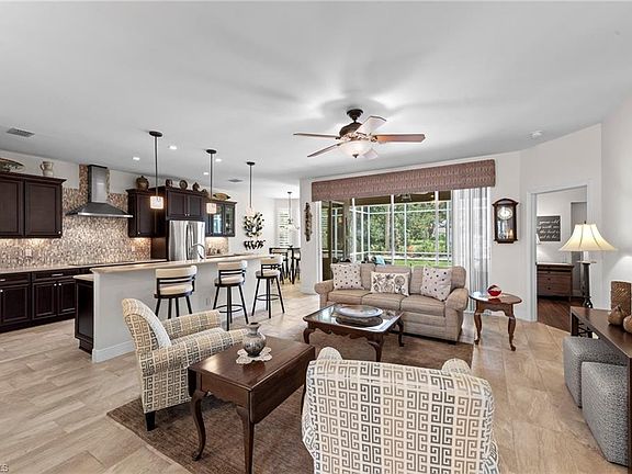 Beautifully updated Dover floor plan located in the desirable Country Creek community! This meticulously maintained home showcases custom upgrades throughout and a thoughtfully designed layout perfect for entertaining. The spacious kitchen features a large island overlooking the great room, breakfast area, and rear lanai—ideal for gatherings. The gourmet kitchen boasts wood cabinetry, stainless steel appliances including convection wall oven and microwave, induction cooktop, quartz counters, and a stunning custom waterfall backsplash. Additional highlights include custom tile flooring throughout, tall baseboards, plantation shutters, updated lighting, mirrors, and ceiling fans. The primary suite offers a walk-in closet with built-in cabinetry and an upgraded bath with dual sinks, custom wood vanity, linen storage, and a beautifully tiled shower with glass enclosure. The guest bath has also been updated with a wood vanity and granite countertop. Major improvements include a new roof (2023), hurricane-impact windows and front door (2024), and new washer and dryer (2025). Enjoy relaxing on the spacious screened lanai with desirable eastern exposure. The garage features a built-in workbench and cabinetry, and a whole-house water filtration system adds extra convenience. This stunning home is truly move-in ready and loaded with quality finishes throughout! The Villages at Country Creek is a friendly, affordable, amenity rich, lifestyle community featuring a newly renovated 18-hole par 61 executive golf course, combined with the friendliest people you’ll find anywhere. Community pools, exercise room, bocce court, tennis, horseshoes, and more! Enjoy the good life with community pools, dining, community activities, and more.
