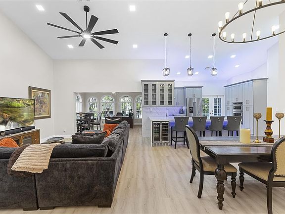 Located in the very exclusive gated Eagle Trace Country Club. Beautifully Updated Home on a Corner Cul-de-Sac Lot within the Georgetown community. This residence offers 3 bedrooms plus a versatile bonus room perfect as a den, office, or 4th bedroom. The open concept kitchen with soaring vaulted ceilings highlights an impressive 11-foot quartz peninsula with matching backsplash, lighted upper and lower cabinets, a wine fridge, and Brand New KitchenAid appliances. French doors open to the screened patio, ideal for entertaining or everyday relaxation. Smart dimmer switches and high-tech lighting add modern convenience throughout. Luxury vinyl plank flooring flows seamlessly, complemented by exotic fixtures and fresh interior paint completing a stylish, truly move-in ready home.
