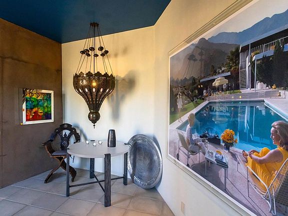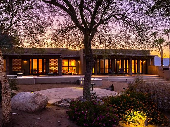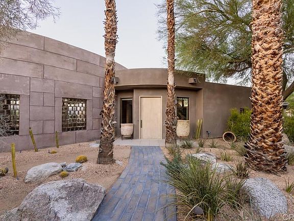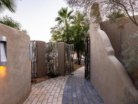 The desert has inspired some great works of art. It most certainly did in this amazing, one-of-a-kind Rams Hill home, in a gorgeous setting in the spectacular Anza-Borrego desert. Rayos de Luz has distinguished history. In 1990 it received a Home of the Year Award of Excellence from San Diego Home and Garden Magazine, Recognition of Design Excellence and Creative Lifestyle. In recent years it has been extensively and carefully remodeled by the owner-designer, with architect Jane Morley and renowned metal-sculptor John Richen. The result is a sophisticated but earthy, gallery-like space meant to accommodate and entertain any group, from small family to large party, in style and comfort. The radiused great room has a beamed tongue-in-groove ceiling that draws the eye through engineered glass panels to the stunning desert and mountain panorama in daylight, and to the striking cylindrical fireplace at night. The lounge-lobby atmosphere offers several comfortable gathering spots, along with kitchen and bar seating. Glass doors slide wide for indoor-outdoor living. This semi-rotunda is surrounded by a dramatic half circle gallery hallway that leads to four bedrooms and three bathrooms, all outfitted to perfection. The master suite features a private sitting room, walnut closets, and motorized window shades. The master bath rivals that of the most luxurious spa with a freestanding custom tub, walk-in glass shower, heated floors, on-demand hot water, and a lovely courtyard view. The atmosphere of a fine hotel is extended for your guests, too. Both guest rooms have state-of-the-art en-suite bathrooms with exceptional tile work and fixtures. One has a separate sitting/media room that could be used as a fourth bedroom or office. Both have beautiful patio or desert views. There’s even an outdoor shower, pool and spa. Outdoors, the ambience expands with extravagant water features, tasteful landscape and numerous generous patios for entertaining, as well as shady, secluded spots for solitary sunset moments. Outdoor sculptures and hardscape include a fanciful nod to ancient architecture, almost as timeless as the desert itself. As night falls, exquisite custom lighting, inside and out, transforms this magic place, and you’ll know you’ve found your Rays of Light.