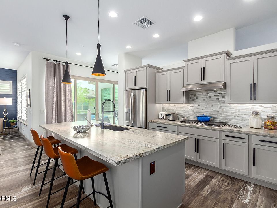 Price Improvement!!! Welcome to this highly sought after, 55+ gated community nestled in the White Tank Mountains! The inviting courtyard overlooks a gorgeous greenbelt and the beautiful surrounding hills. This immaculate home is highly upgraded, boasting a neutral color palette, spacious great room, plantation shutters throughout, luxury vinyl plank flooring, and ceiling fans throughout. The gourmet kitchen comes complete with a large quartz center island, contemporary backsplash, gas cooktop, stainless steel appliances, and upgraded cabinets. Patio off kitchen has a remote-control power sunscreen for extra comfort. Master suite has custom barn doors leading you into the master bathroom offering a custom walk-in tiled shower, double vanity sinks, and a large walk-in closet. Guest bedroom is large enough for a king-sized bed and has its own full bathroom. A barn door can easily be added for privacy. This award-winning community offers two golf courses, community pools, BBQ's, Gym, Clubhouse, quaint marketplace shopping, coffee shops, restaurants, and beautiful landscaping throughout the community. Call today!