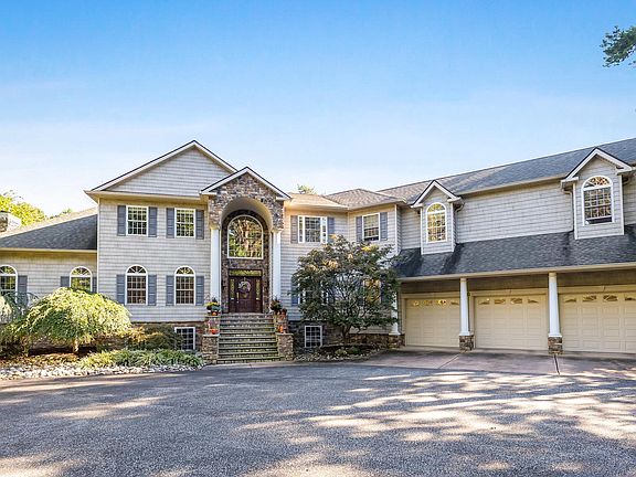 This stately 5-bedroom, 3.2 bath custom home offers over 5,200 sq. ft. of elegant living space across a scenic 7 acre private wooded setting. A long private driveway leads to beautifully landscaped grounds and a welcoming fieldstone entry.  Stay warm as you pull into the heated 3 car attached garage.  Upon entering, you'll be captivated by the dramatic grand foyer with soaring vaulted ceilings and a stunning winding staircase.  Wander to the left to find a formal living room/library, formal dining room and an additional flex/tv/game/kids room with a fireplace, half bath and glass doors leading out to a flagstone patio with plenty of seating.  Walk down the steps to a hot tub situated among the woods for a truly private experience. Both of these rooms can be re-purposed for your individual needs. Wander to the right to find a spacious office with French doors accompanied conveniently by a half bath right next door.  Continue down the hall to the spacious two-story family room with fireplace, where natural light pours in through an abundance of windows. The family room opens to one of three beautifully manicured patios, providing the ideal setting for entertaining or enjoying serene outdoor living. Walk through the family room past the back second staircase to one of the five bedrooms.  Keep walking down the hall to the 3 car heated garage and a door leading to the third outside space including a stone patio, grassy side yard and playground.  Right in the center of the home, you’ll find an expansive kitchen open to the family room on one end and an adjoining butler’s pantry with wet bar and wine cooler connected directly to the formal dining room featuring crown molding, chair rail, recessed lighting and a large storage closet.  The kitchen showcases raised-panel 42” maple cabinetry, 3 pantry closets, stainless steel appliances, a 5-burner gas range, oversized island with breakfast bar and separate casual dining space for plenty of seating.  Take one of the two staircases upstairs, to the luxurious primary suite featuring a sitting room, fireplace, two walk-in closets with windows, and a spa-inspired bath with dual separated vanities, soaking tub, and spacious shower. Walk down the hall to another bedroom with an en-suite bathroom. A laundry room and two more bedrooms with a full bathroom connecting them round out this floor.  Additional highlights include a full unfinished basement with 9-foot ceilings, Hardwood floors flow throughout first floor and plenty of closet space   Located midway between Atlantic City and Philadelphia, 3.4miles to train station that goes to both destinations.   Train to NYC from there.  For outdoor lover, Atsion state park with hiking trails is close by as well as numerous lakes in area for swimming, canoeing and camping.  Easy drive to all shore points.   Enjoy privacy, comfort, and elegance—all just minutes from major routes and conveniences. Schedule your private tour today.