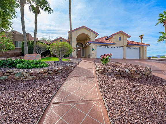 This Pool home residence maximizes natural light, stunning views, and everyday livability. A gorgeous bay window serves as a show-stopping focal point and provides views of the sparkling pool and surrounding landscape. Enjoy mountain views, an attractive low-maintenance yard, a refreshing pool, and your very own putting green. These features create the perfect setting for both relaxation and recreation. Inside, the split floor plan provides privacy and convenience, creating distinct spaces for entertaining and unwinding. Brand new paint throughout & carpet in the bedrooms. The living area is anchored by a cozy fireplace, adding warmth and charm throughout the seasons. 3-car boat-deep garage, which offers ample room. HOA community that provides, community pool, playground, park. Centrally located in Bullhead City, close to Laughlin Nevada, shopping, Hospital.