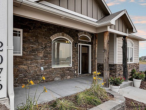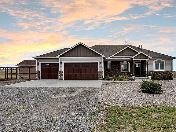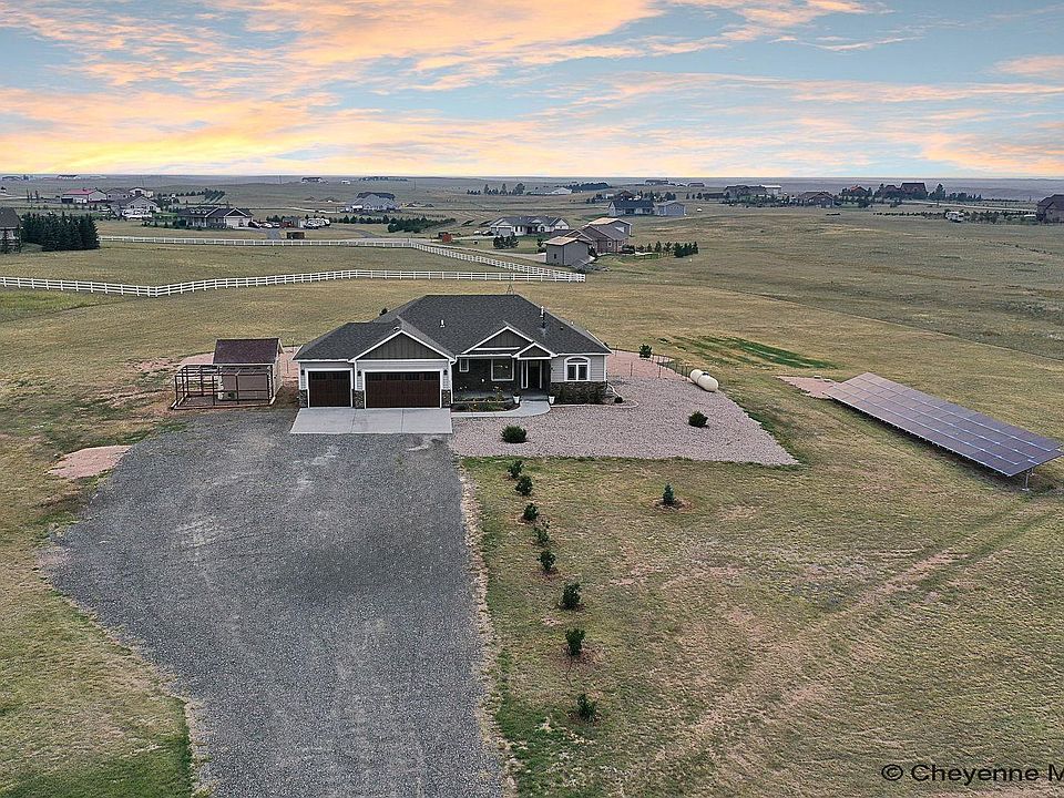 This breathtaking close-in rural retreat on 8.03 acres is just 15 minutes from Warren Air Force Base! The well thought out upgrades are what set this property apart. Surrounded by xeriscaped yards designed for low maintenance, water conservation, and added fire protection. Energy efficiency and peace of mind come standard with solar panels and a whole-house Generac generator. Inside, the freshly painted and spacious main-floor features a primary suite with double walk-in closets, while new luxury vinyl plank flooring on the main level and basement offers modern style, durability, and easy care. The beautifully updated kitchen features solid wood cabinets, granite counters, and stainless steel appliances, opening to an airy layout with vaulted ceilings and a dramatic river-rock fireplace that soars to the peak. Bathrooms are elegantly tiled, and the main-floor laundry is enhanced by additional hookups in the garage. The fully finished basement shines with a huge family room, tall ceilings, and natural light—ideal for gatherings. Relax on the front porch at sunrise or the back patio at sunset, A deluxe chicken coop/tool shed completes the package. Pre-inspected and offered with a 1-year home warranty—move in ready for the good life!