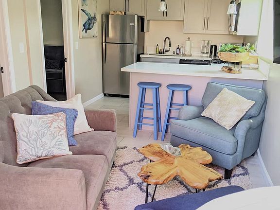 Master includes walk in closet, large room, queen bed and side tables. Beautiful sizable fully equip kitchen with open concept attached to living room with smart TV, loveseat and 3 extra seating. Bathroom with tub and cabinets for storage. Second bedroom has a twin bed, closet, and desk/workspace.