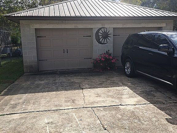 1 level brick with metal roof and detached 2 car garage with back yard chain link fence.
