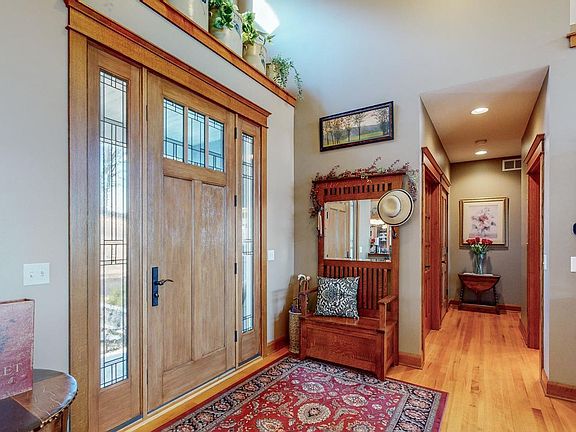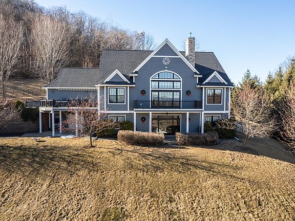 Exceptional custom home with luxury finishes on a sprawling 60 acres overlooking the beautiful Mississippi valley! This stunning custom-built 5 bed, 3 bath, home offers a perfect blend of craftsmanship, comfort, and modern amenities. Designed with impeccable attention to detail, this home features vaulted ceilings on the main level with quarter-sawn oak floors, doors, cabinetry and trim throughout, creating a warm and timeless aesthetic. The spacious kitchen is a chef’s dream, featuring quartz countertops, stainless steel appliances, and custom cabinetry, while the formal dining area is perfect for entertaining. The great room boasts a gas fireplace surrounded by custom cabinetry. The large windows and patio doors offer expansive views of a breathtaking backdrop of the property and the Mississippi River Valley. The lower-level family room features a cozy wood-burning fireplace, complemented by in-floor heating. The walk-out lower level boasts 10-foot ceilings and large patio doors that add to the spacious atmosphere. A geothermal heating system ensures energy efficiency, along with an air exchanger and radon-eliminating system for superior indoor air quality. The expansive owner’s suite is a true retreat, featuring his and hers walk-in closets, a spa-like bath with a soaking tub, walk-in shower, and heated floors. The large laundry room is thoughtfully designed with a sink, custom cabinetry, and heated floors. All bedrooms include walk-in closets, with plush carpeting for a cozy touch. Outdoor living is just as impressive with two decks with high end composite, stamped cement patio, cement siding, and a new roof (2023). The heated and insulated garage includes a quality garage floor coating, while the heated ?workshop below the garage provides additional workspace. For those who love the outdoors, the 50x80’ pole shed includes a heated, fully furnished 1 bedroom, 1 bath bunkhouse and insulated garage, along with an additional small garage for extra storage. The property is a hunter’s paradise, featuring prime deer hunting, established trails, a scenic pond, and a 125-tree fenced apple orchard with grapes, blueberries, and raspberries. The hillside curb appeal is amazing with a vinyl fence, paved driveway, and breathtaking surroundings that complete this one-of-a-kind property. Don’t miss this rare opportunity to own a home that truly has it all!